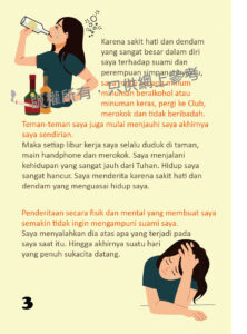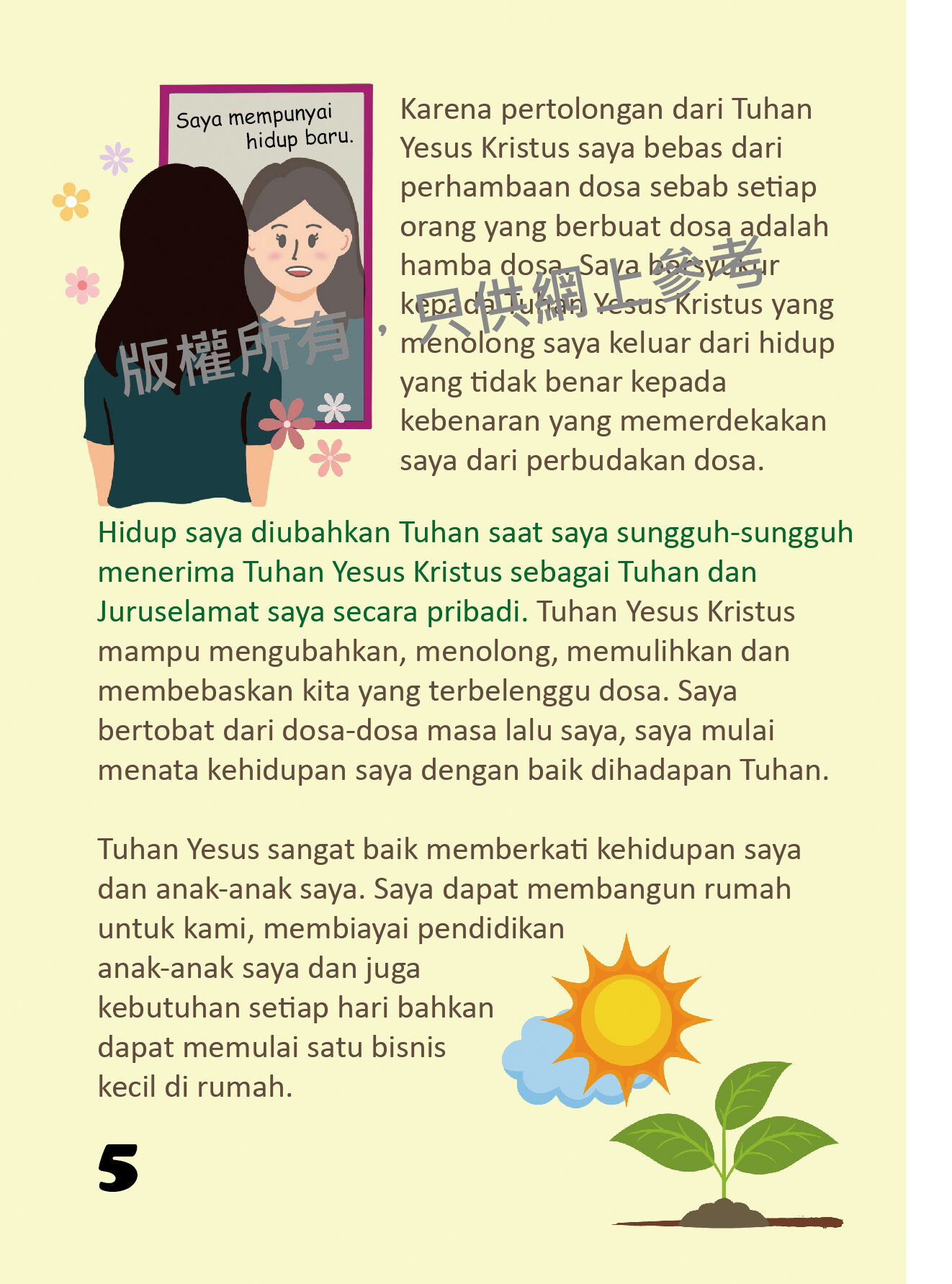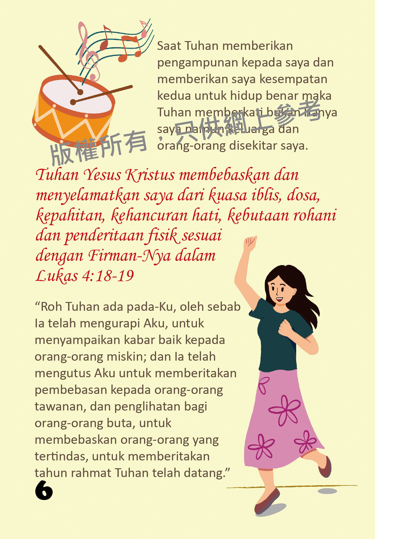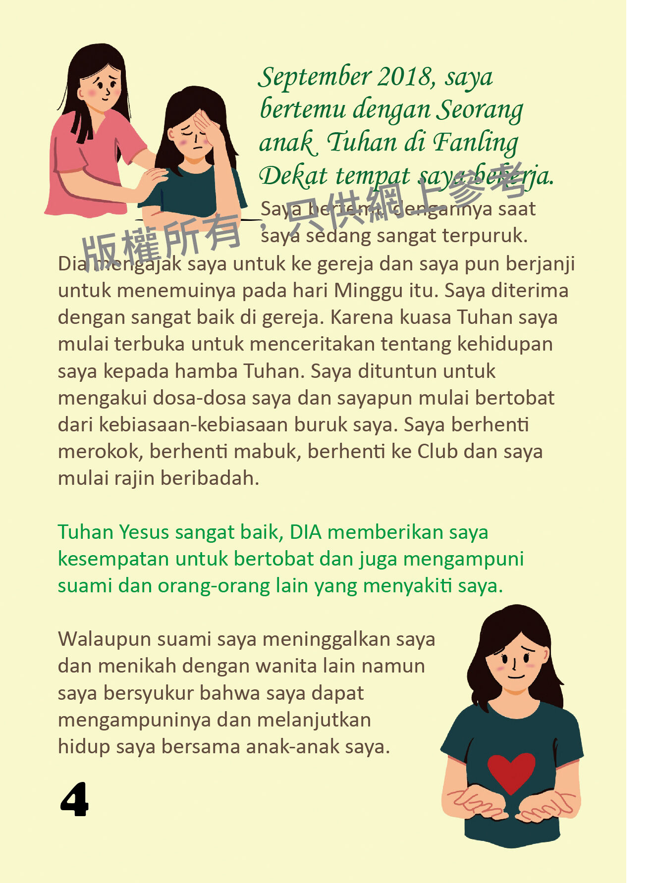 單張是一位印尼姐姐的真實見證。原本擁有幸福家庭的印尼女士,為了養活家人而來香港做家傭。由於和丈夫分隔兩地,夫婦關係出現問題,最終被丈夫拋棄。自始以後,她過著放縱的生活。她如何被耶穌尋找,返回耶穌的懷抱,緊緊跟隨主?願她的見證,成為許多姐姐的祝福。